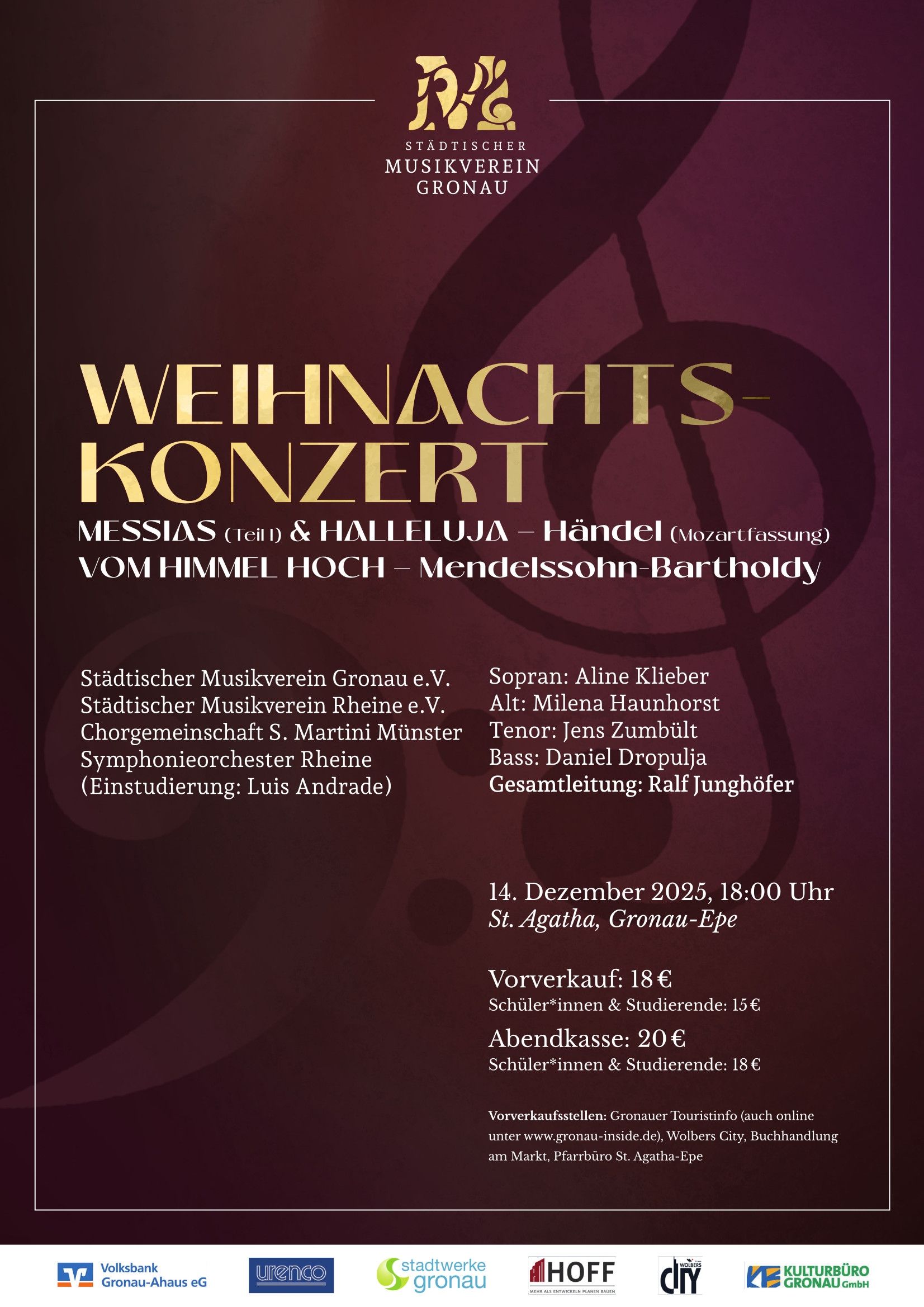 Der Städtische Musikverein ist ein gemischter Chor mit etwa 40 Sängerinnen und Sängern, der sich der Aufführung großer Werke und Oratorien verschrieben hat. Zusammen mit dem Partnerchor "Städtischer Musikverein Gronau" und dem Symphonieorchester Rheine werden zweimal im Jahr Konzerte jeweils in Rheine und in Gronau, aufgeführt. Zum Repertoire gehört eine Vielzahl weltlicher und geistlicher Chorwerke aus dem Barock bis in die Moderne. Durch regelmäßige unterstützende Stimmbildung und intensive Probenarbeit erreicht der musikalische Leiter Ralf Junghöfer ein hohes musikalisches Niveau.